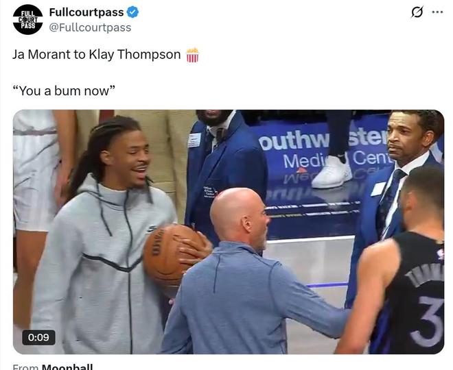 而在双方冲突被拉开后,莫兰特还在队友斯潘塞采访时,阴阳怪气暗讽克莱到:“告诉他们今晚最好的射手是谁!不是来自金州的那个家伙。”