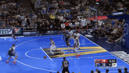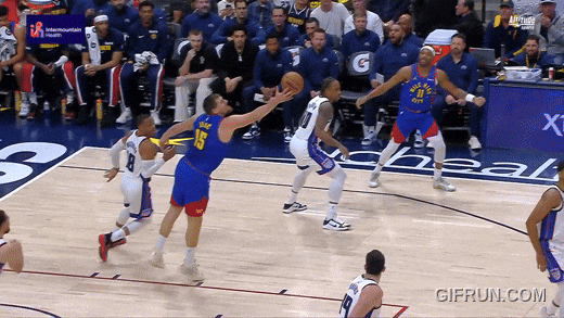 一个击地喂沃特森上篮,前因是接球不稳,拉文夹击,约基奇接球落地,转身击地,沃特森内切扣篮。